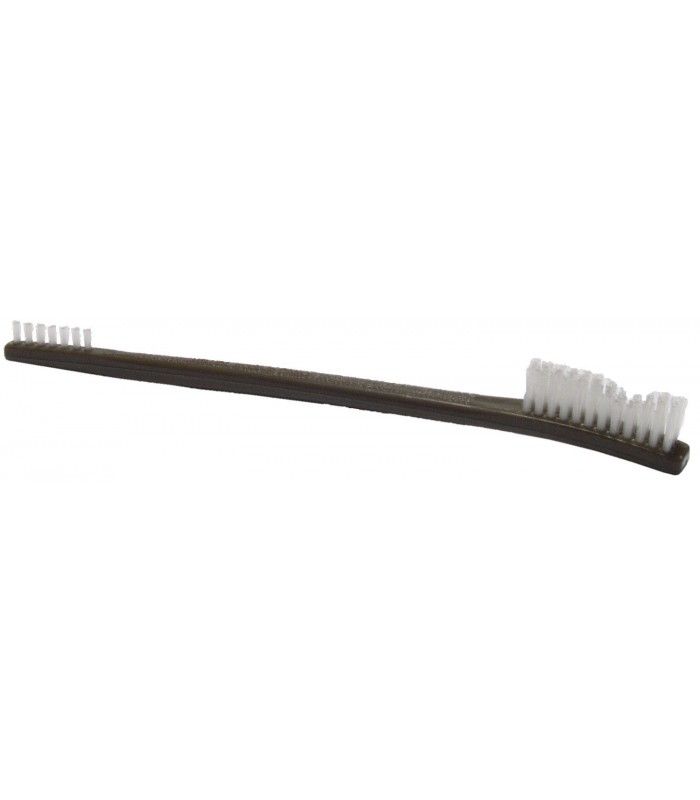 Двухсторонняя щетка с белой нейлоновой щетиной средней жёсткости на пластиковой ручке. Для очистки поверхностей маленького размера, удобна при удалении загрязнений из швов.