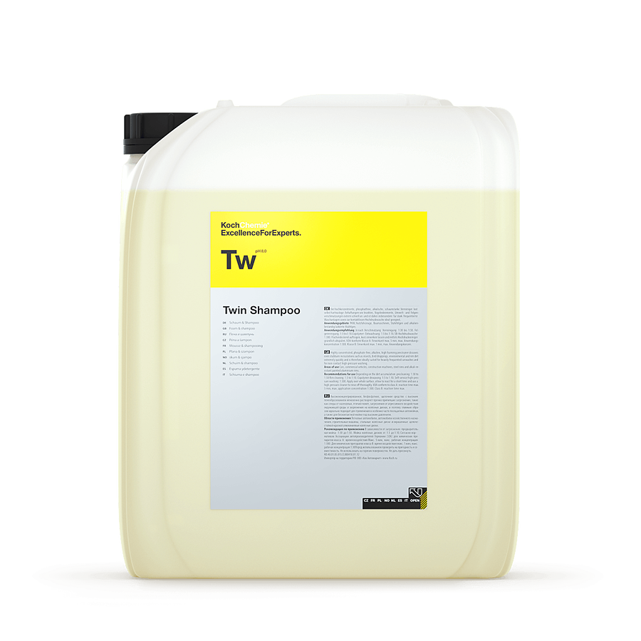 Высокое содержание тензидов в шампуне способствует самоочищению щёток, губок, тем самым обеспечивая их стойкость и длительную эксплуатацию. Задействованные амфорные тензиды одновременно подготавливают поверхности к сушке. Благодаря сильной очистительной способности, замечательному образованию пены и приятному освежающему запаху TWIN SHAMPOO обеспечивает во всех мойках первоклассный результат. TWIN SHAMPOO содержит исключительно биологически моющие вещества, быстро расщепляемые по стандартам «EURO-Norm B 5106», что позволяет не нагружать очистные сооружения при работе с оборотной водой.